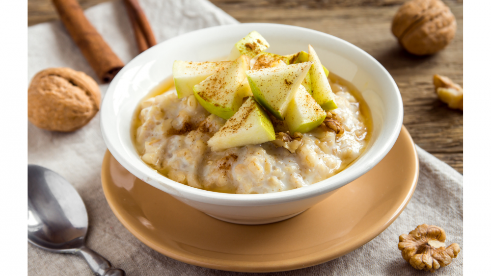 ovesné vločky 50g, dýňové semínko 5g, nastrouhané jablko 100g, skořice, mléko polotučné 150ml, voda 50ml |